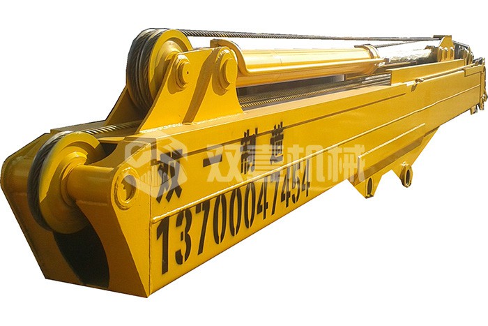 三節臂:25T級挖掘機三節臂可挖深24米,35T級挖掘機三節臂可挖深32米;臂體采用700L或960高強度板材,滑輪安裝結構在臂外部,便于保養維修,結構設計尺寸大,延長使用壽命。